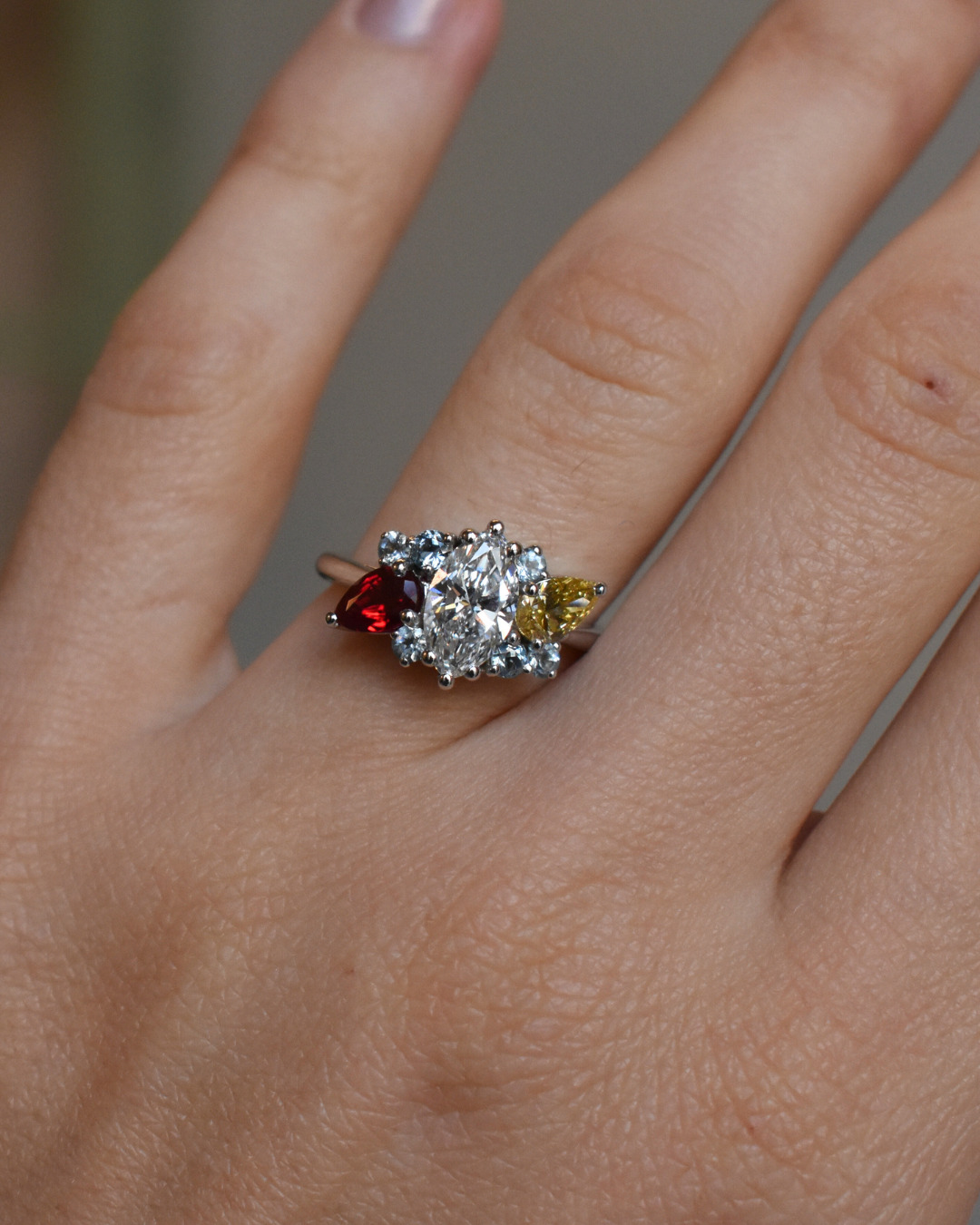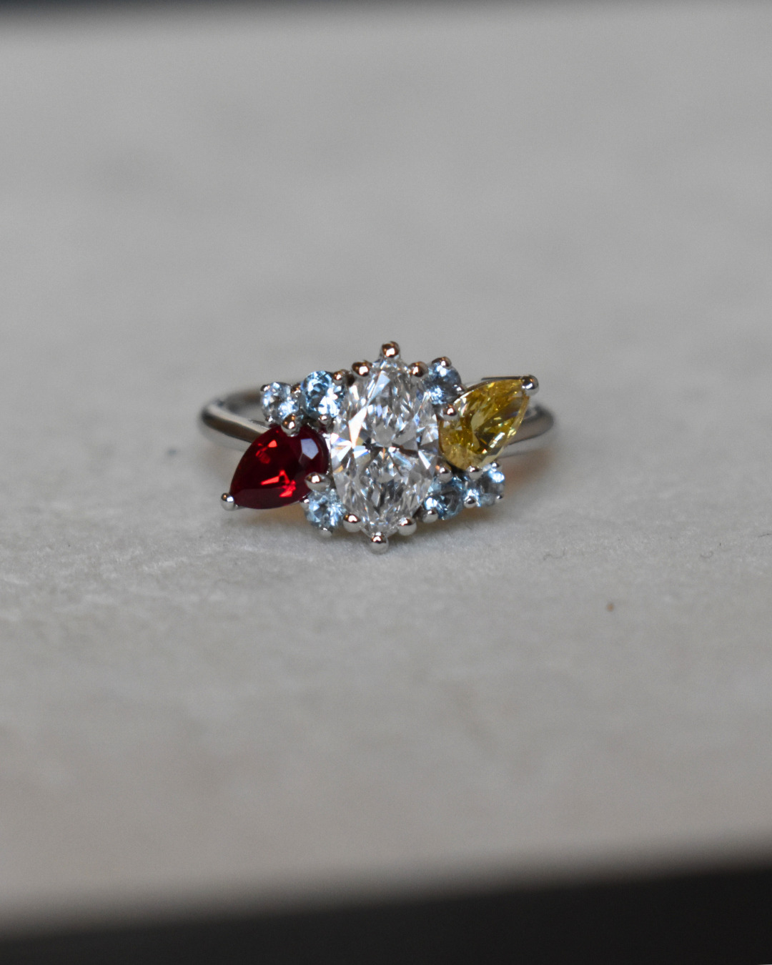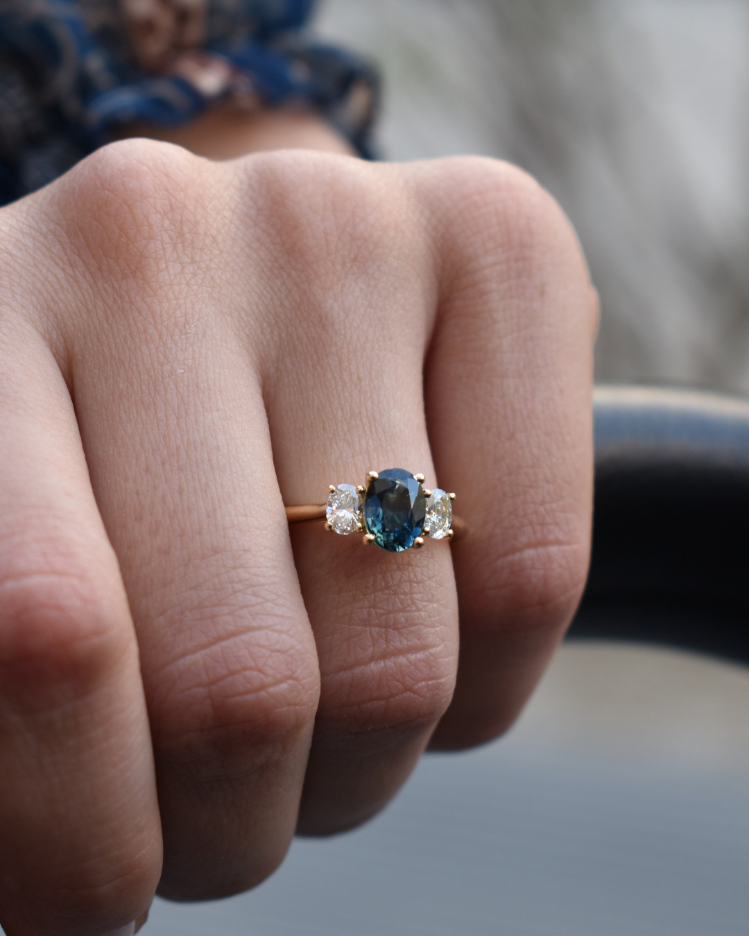 Ognuna delle 3 pietre ha un significato simbolico: rappresentano il passato, il presente e il futuro di una relazione. Solitamente al centro si trova il diamante, che simboleggia rarità e resilienza, ma il 2023 ha visto una forte richiesta anche di gemme preziose colorate per aggiungere un tocco giocoso, unico e personalizzato all’anello.