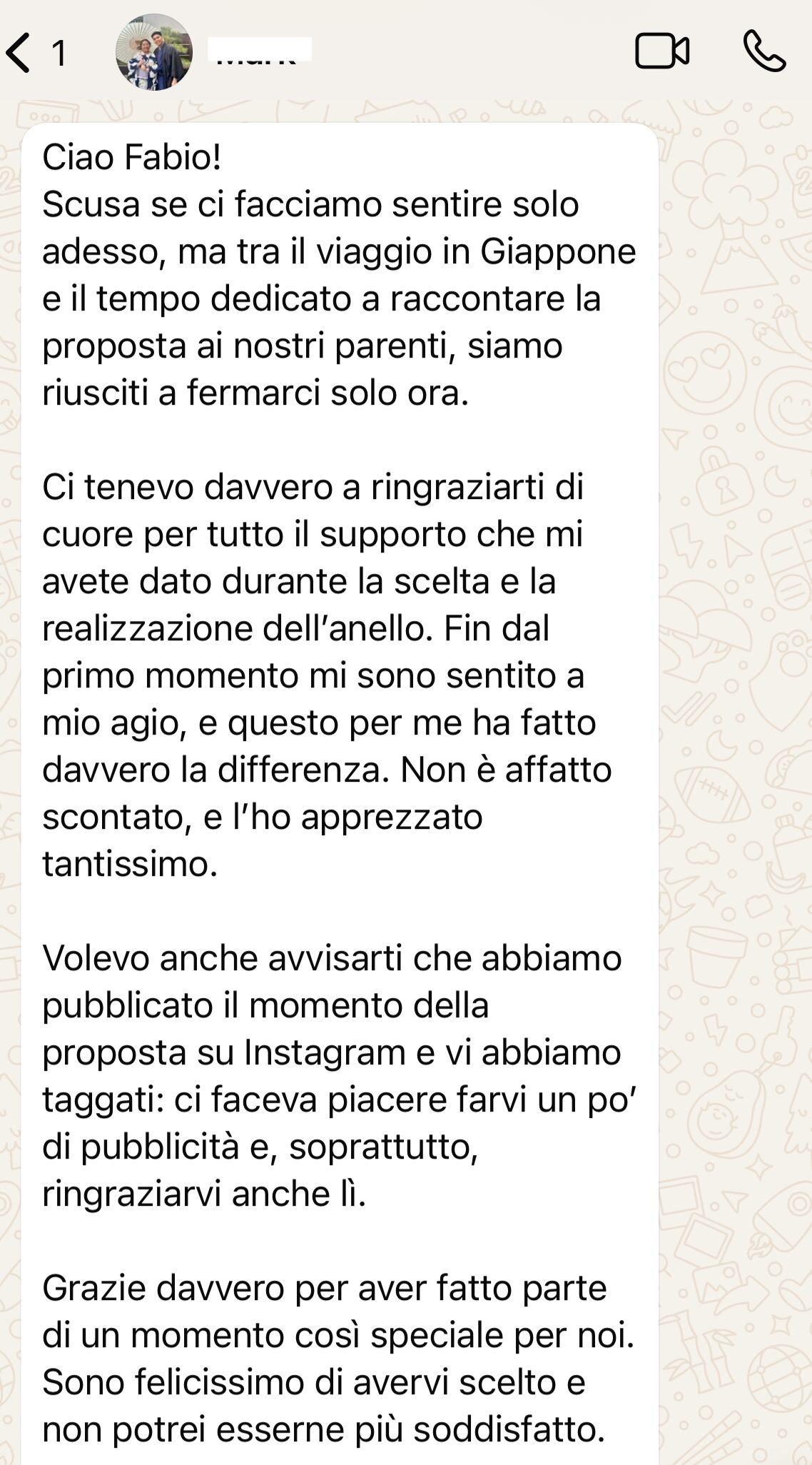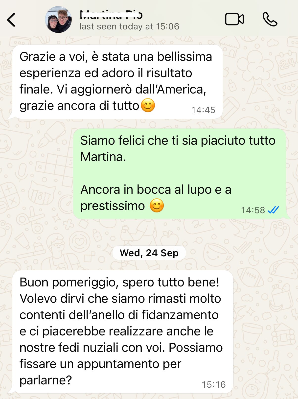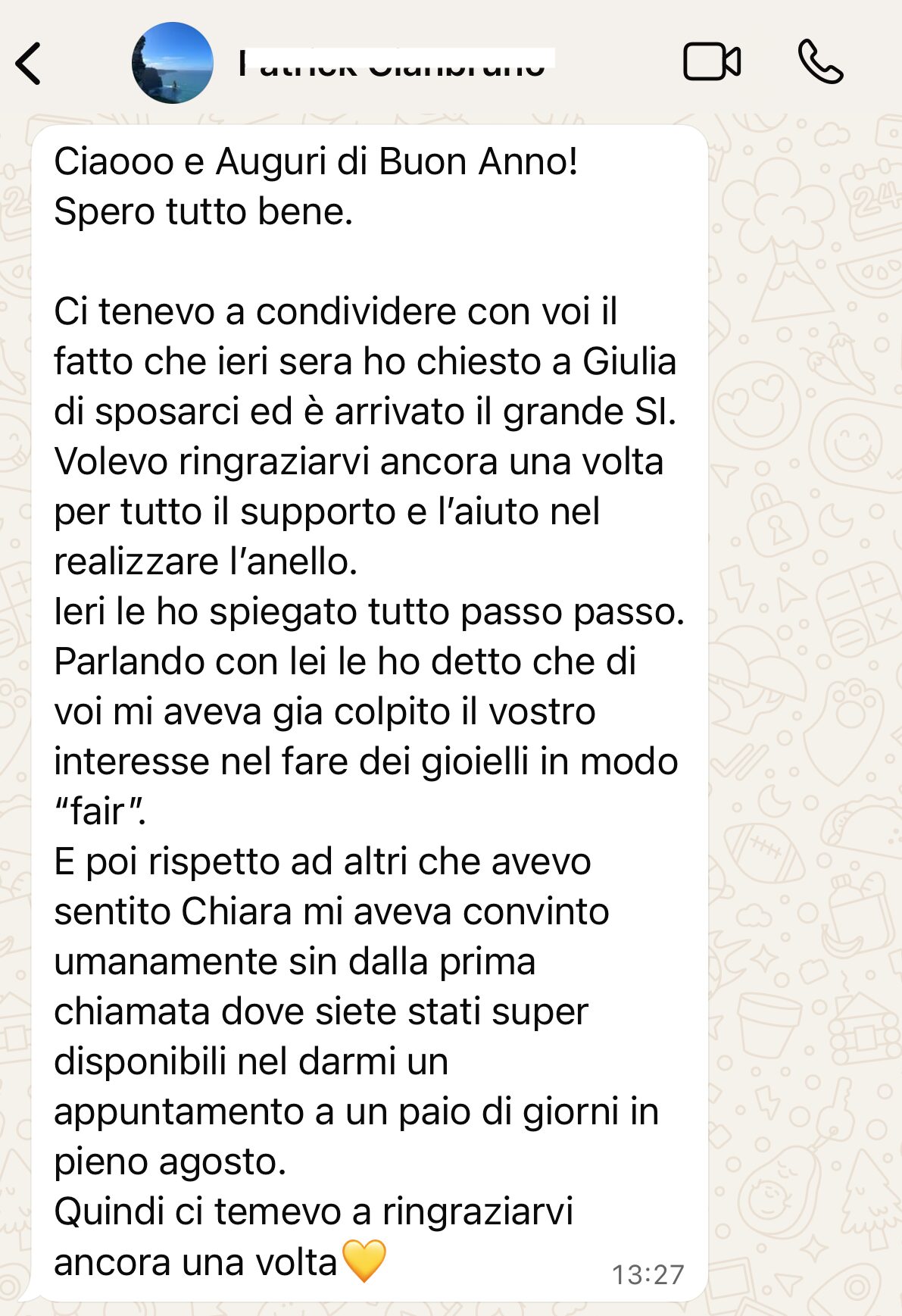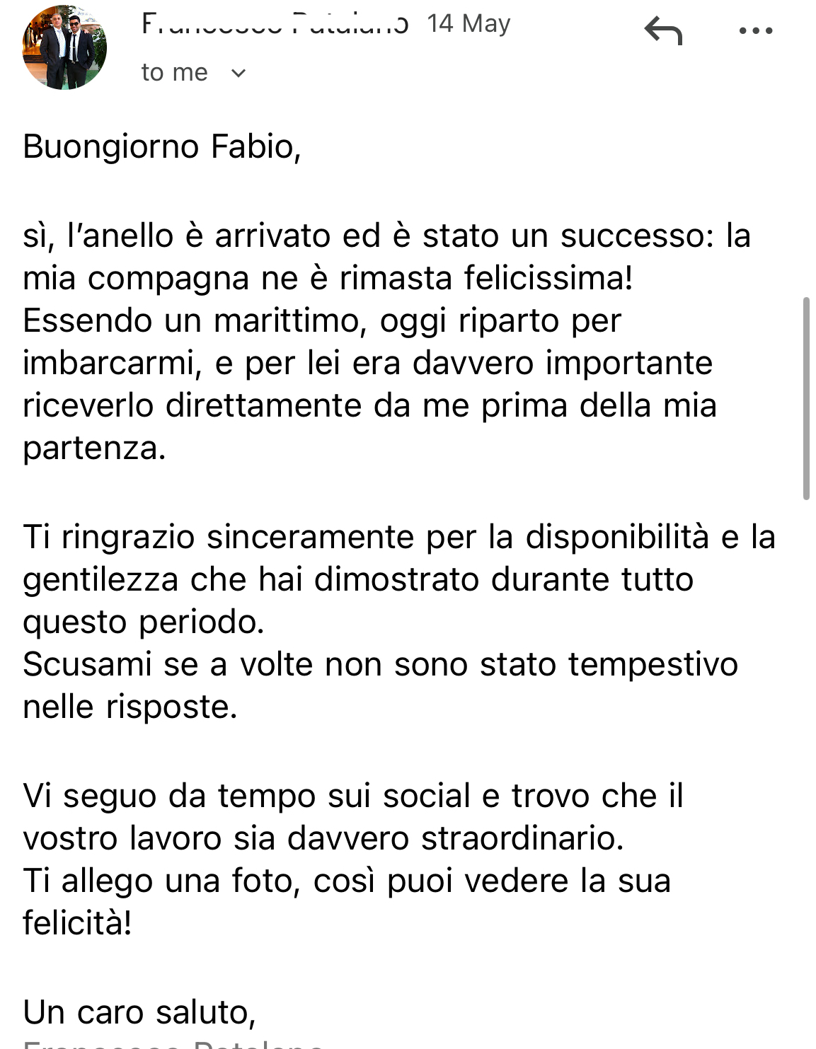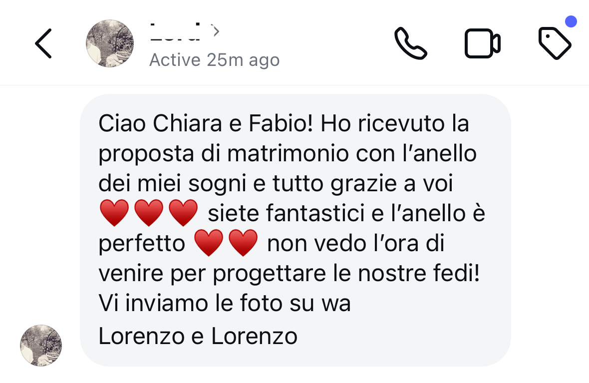 Naile Ciccone2025-09-17Quando si cerca l'anello di fidanzamento perfetto, si cerca qualcosa di più di un semplice gioiello: si cerca un'emozione, una storia. Ed è esattamente quello che abbiamo trovato in Fàbera. Io e il mio ragazzo ci siamo innamorati della loro filosofia e, dopo aver visto il loro sito, abbiamo capito subito che erano le persone giuste per noi. Sin dal primo contatto, la professionalità e la passione di Chiara e Fabio sono state evidenti. Sono riusciti a rendere un momento così importante un'esperienza serena e piacevole. Il processo online è stato semplicissimo e intuitivo, e la loro assistenza costante ci ha fatto sentire sempre supportati. L'anello è arrivato in tempi rapidi, con una spedizione perfetta, ed è stato ancora più bello di quanto potessimo immaginare. Consigliamo Fàbera a chiunque voglia vivere un'esperienza d'acquisto autentica e indimenticabile. Grazie, ragazzi, per aver reso questo momento così speciale e per aver creato l'anello dei nostri sogni!Brandon VanderBeek2025-09-16Chiara and Fabio at Fàbera provide excellent service and beautiful rings! They helped me create a custom engagement ring and I could not be happier with the result.Gonzalo Saravia Vitolo2025-09-13The whole experience has been amazing! The dedication of Chiara and Fabio in every step of the process makes everything feel magical.Beatrice Erriu2025-07-02Fabio e Chiara ci hanno aiutato a realizzare delle fedi etiche per il nostro matrimonio. Volevamo che il simbolo della nostra unione fosse di grande valore anche morale, oltre che materiale, e premiare una piccola realtà artigianale sensibile alle tematiche sociali ci è sembrata la scelta più bella da fare. Siamo stati coinvolti in ogni fase della realizzazione degli anelli ed è stato un piacere andare fisicamente a Firenze per conoscerli e ritirarli. Che dire, grazie!Matteo Scardigli2025-06-20Competenza, professionalità, gentilezza e tanta cura dall’inizio alla fine. Ottima esperienza!giovanni Bruzzaniti2025-06-20Mi sono rivolto a Fabio e Chiara per realizzare l’anello di fidanzamento e non potrei essere più soddisfatto. Fabio è stato estremamente disponibile, è venuto incontro ad ogni mia esigenza, con pazienza ed estrema gentilezza e mi ha guidato con professionalità nella scelta delle soluzioni migliori. Il risultato finale è stato semplicemente perfetto, curato nei minimi dettagli e realizzato con grande maestria. Un servizio eccellente, attento e su misura. Consiglio vivamente a chiunque cerchi qualità, competenza e un tocco di umanità in più. Grazie ancora di cuore!Giacomo Sbaragli2025-06-17Consigliatissmo! Fabio e Chiara hanno a cuore prima di tutto il rapporto con chi hanno davanti come persona (non solo come cliente) e lo dimostrano con la gentilezza e la disponibilità. Ovviamente questo si riflette sui loro manufatti realizzati in maniera unica ed etica, dimostrando che è possibile scegliere contemporaneamente sia la bellezza di quanto realizzato in un gioiello che il valore sociale compreso nel materiale utilizzato. Ce n'era bisogno. Grazie ancora!Valutazione complessiva Google 5.0 su 5, in base a 108 recensioniVuoi scrivere con noi la tua storia?Iniziamo con il gioiello dei tuoi sogniFree shipping | Lifetime warranty | No-obligation pre-purchase consultation Ignora